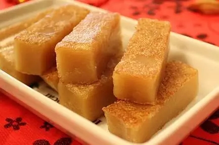 年糕:又稱粘粘糕,取年年高之意。在南方用糯米制成,年糕北方則為黏黍。年糕的歷史悠久,漢朝的米糕已有“稻餅”、“糕”、“餌”、“糍”等名稱。6世紀食譜《食次》就有年糕“白繭糖”的制法,北朝《齊民要術(shù)》記載了將米磨成粉制糕的方法。元旦吃年糕盛行于明清時代,尤以南方流行。明末《帝京景物略》卷二記載,正月元旦,“夙興盥激,吃棗糕,日年年糕”。北方河北嘉靖時《威縣志》說當(dāng)?shù)爻浴罢粞蚋狻?。在南方,江浙的蘇州、嘉定等地方志稱“節(jié)糕”,明正德廣東《瓊臺志》記載當(dāng)?shù)爻源焊猓骸霸┣耙耘捶蹪?jí)蔗糖或灰汁籠蒸春糕,圍徑尺許,厚五六寸,雜諸果品歲祀,遞割為年茶,以相饋答。”其形制類似今天的生日蛋糕。清顧祿《清嘉錄》卷十二記載更為詳細,說將黍粉和糖為糕,叫做“年糕”,有黃色和白色之別。大的一尺見方為“方頭糕”,還有像元寶的“糕元寶”,用于除夕供先、親戚朋友間的贈答。此外,還有細長的“條頭糕”、寬大的“條半糕”。過節(jié)時富家雇人制糕,一般人可在糕店購買。